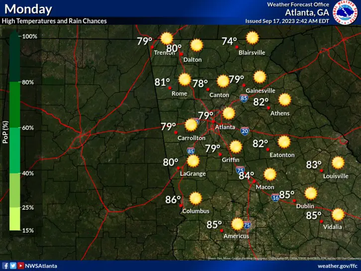 Scattered thunderstorms and generally gloomy weather will give way to cooler temperatures and sunny skies today and tomorrow in Georgia.