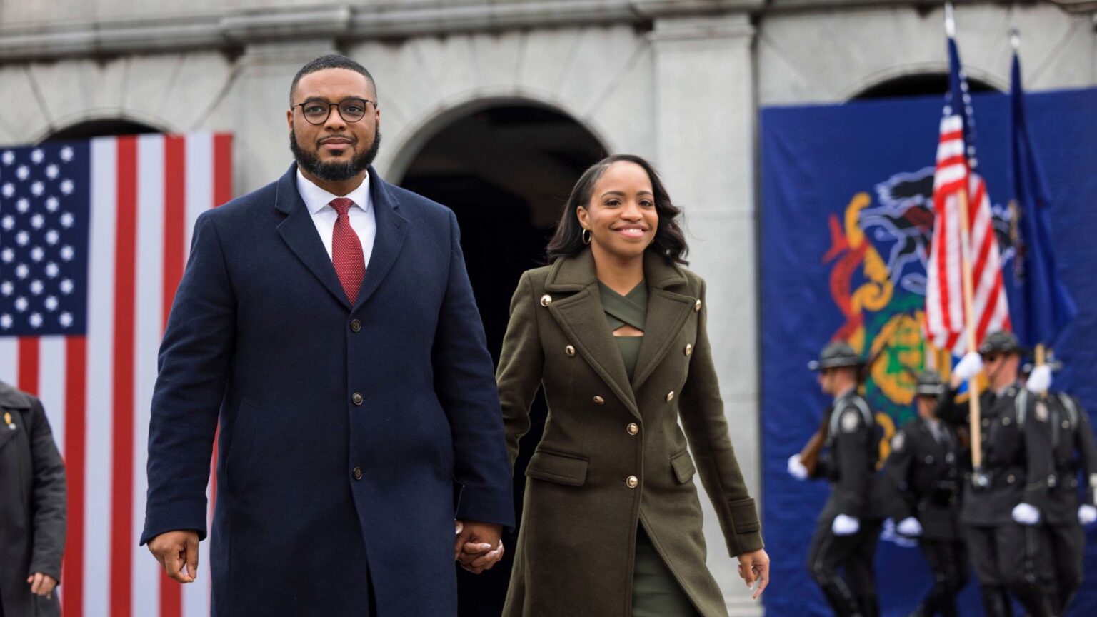 AUSTIN DAVIS, left, was sworn-in as Pennsylvania’s first Black Lieutenant Governor on Jan. 17. By his side is the state’s Second Lady, Blayre Holmes Davis, Austin Davis’ wife.